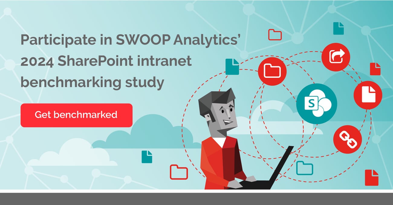 SWOOP benchmarking is free and your data remains anonymous. You must be connected to SWOOP Analytics for SharePoint intranet by March 30, 2024 to be part of our 2024 benchmarking analysis.