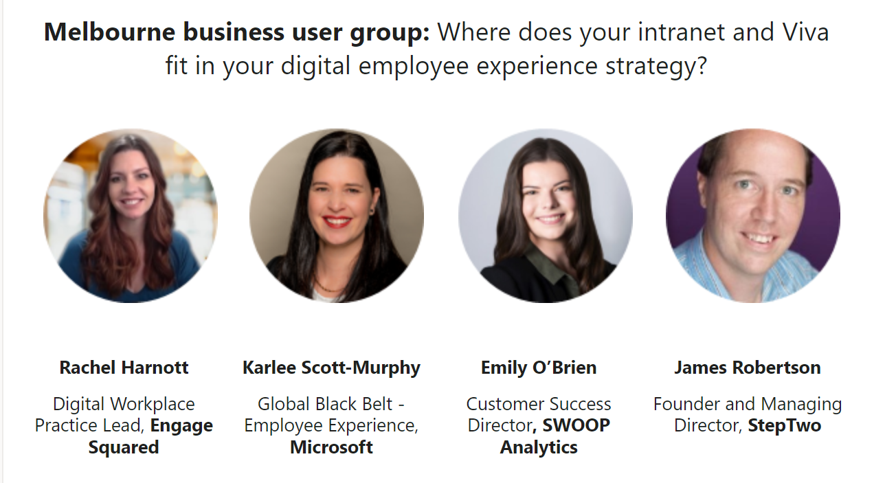 Join Engage Squared, SWOOP Analytics’ Emily O’Brien, StepTwo and Microsoft for breakfast in Melbourne on Thursday, September 22 at 8.30am AEST, or join online, as we discuss the important role your intranet plays in today’s hybrid world.